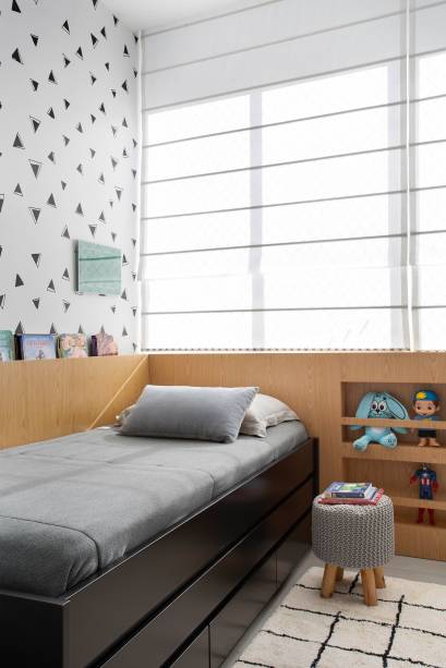 No quarto do sobrinho, Bianca apostou em uma decoração lúdica e com pegada minimalista: o papel de parede de triângulos é preto e branco, assim como o tapete quadriculado, e a marcenaria de freijó é personalizada, com elementos montessorianos.