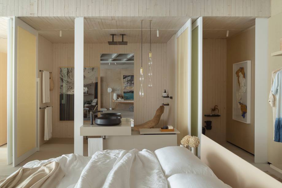 Enquanto isso, toda marcenaria projetada pela arquiteta exibe elementos naturais, pensados para evidenciar a sensação de frescor e leveza – é o caso das portas pivotantes, que delimitam a sala de banho dos demais ambientes do loft.