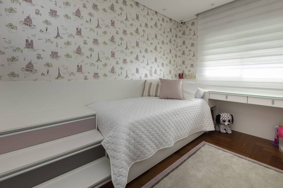 As entradas da cozinha, do closet do casal e do banheiro de funcionário também foram realocadas. Com o foco de integração da principal área do apartamento – sala e varanda gourmet de pé direito duplo – foi feito o nivelamento dos pisos.