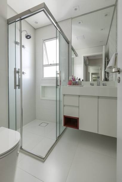 Com originais quatro suítes e acabamentos nas áreas molhadas da unidade, o imóvel teve, como primeira alteração, a retirada destes itens e a ampliação na área da cozinha.