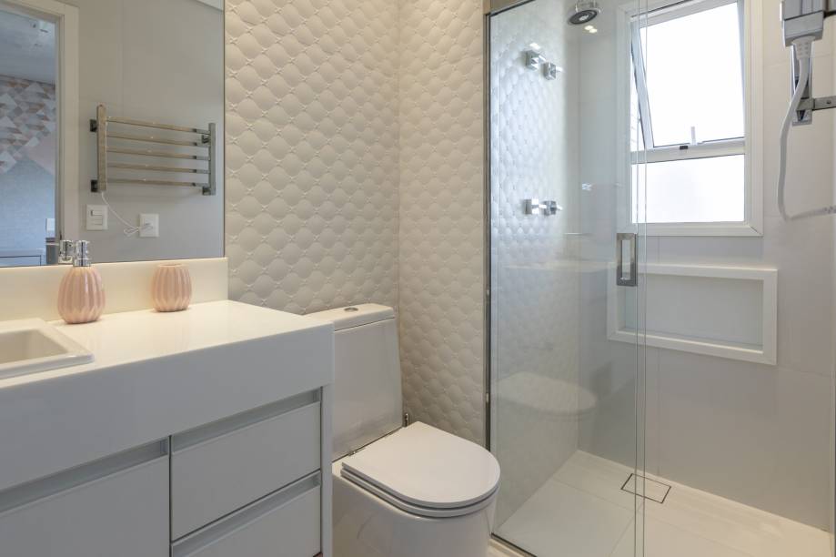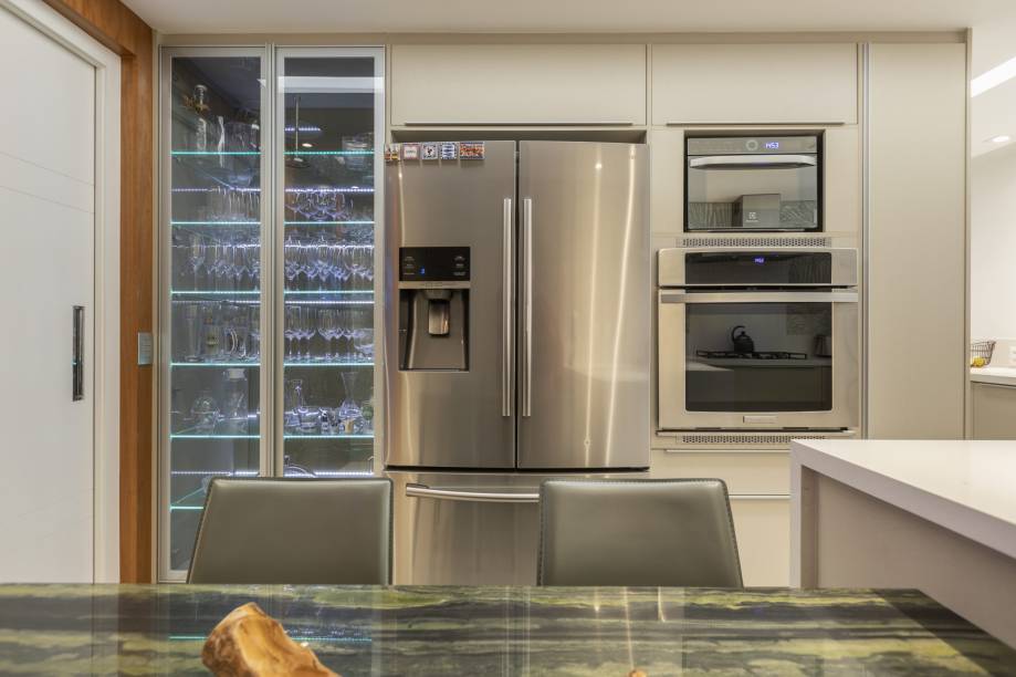 “Porém, o maior desafio da infra foi o deslocamento da churrasqueira na área gourmet. Sem saída na lateral para exaustação do ar, foi necessária uma tubulação que atravessasse a sala de TV, sala de jantar e hall entrada para chegar à área de serviço. Com os pés direitos duplos em conformidade com as vigas e o cinturão presente na sala, fez ser um desafio superado com resultado surpreendente de funcionalidade”, conta a arquiteta.
