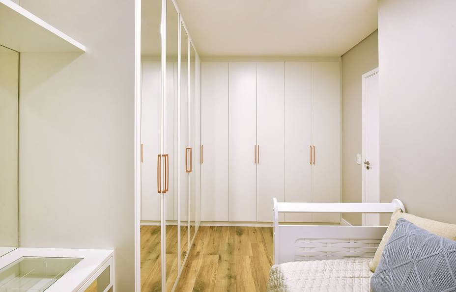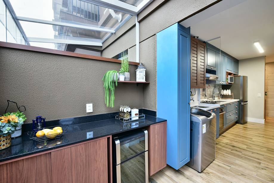 O charme de todo o projeto está na cozinha. Ela possui referências ao estilo provençal do século XVI, com toques modernos e repaginados, tornando o ambiente atemporal. “Utilizamos um armário no tom azul pastel, com detalhes de madeira, aparadores, bancada branca, com o intuito de levar mais charme ao cômodo”, detalha Renata Assarito, a outra sócia.
