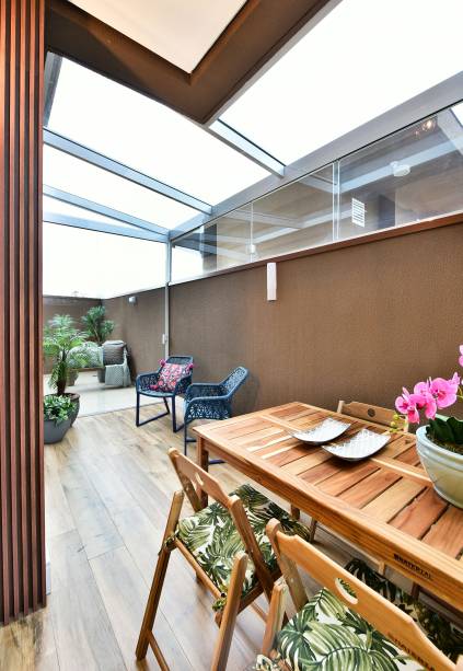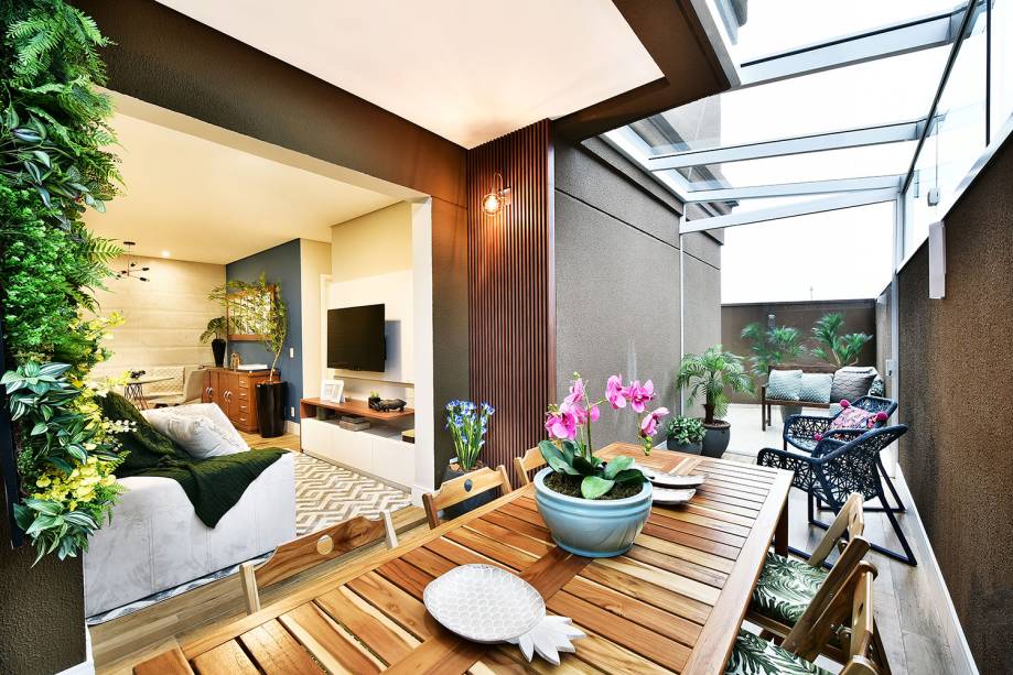 Por fim, a varanda foi fechada com vidro, o que tornou o cômodo uma extensão da área de convivência, cheio de aconchego e conforto.