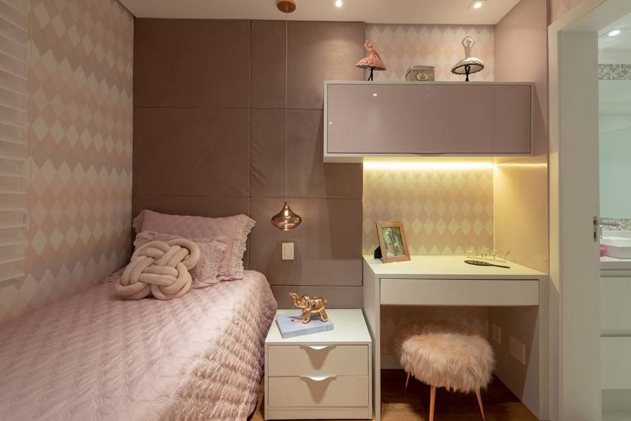 Outro ambiente também foi integrado: a suíte do casal se uniu à varanda do espaço, o que deu a possibilidade de criação de um escritório para os moradores.