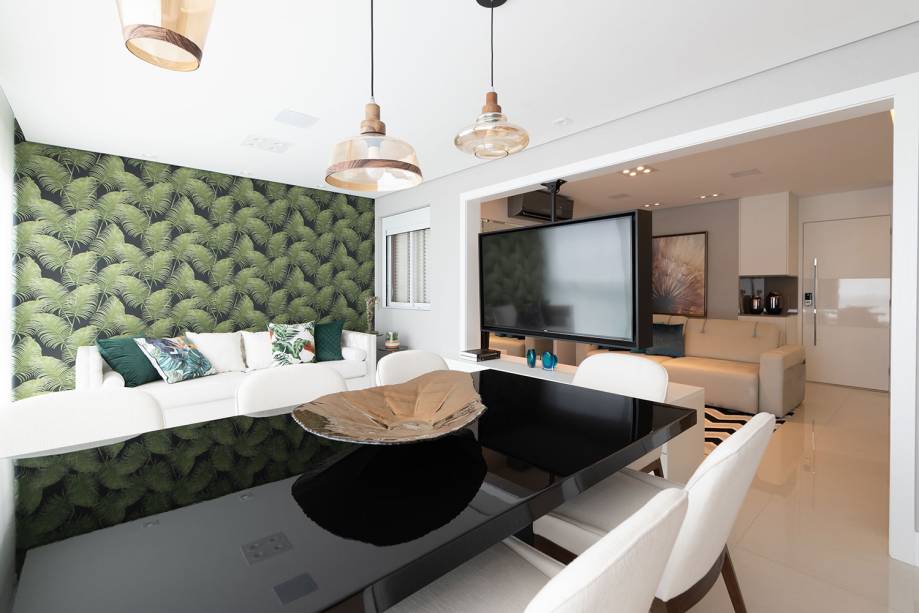 Porém, a grande estrela do projeto são os papéis de parede, em especial, o utilizado na varanda com estampa de folhas, que destaca o sofá branco, perfeito para uma reunião com amigos e familiares.