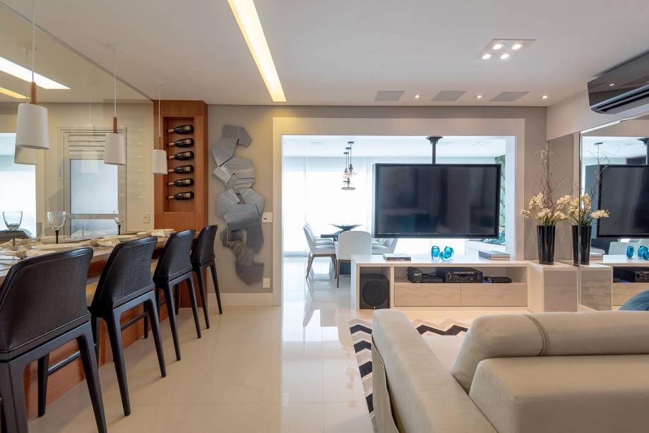 Na concepção do projeto, o maior desafio foi integrar a varanda à sala de convivência, sem descaracterizar nenhum dos espaços. Feito isso, o apartamento ganhou em iluminação natural e maximização de espaço. Neste mesmo local conjugado, um destaque: a TV giratória, que pode ser usada em ambos cômodos.