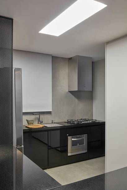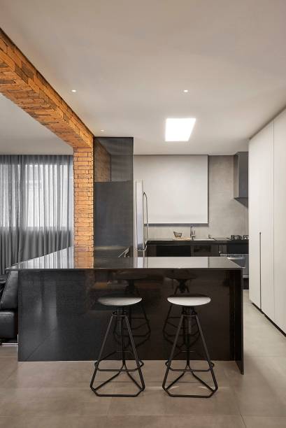 Essas peças mais teatrais são um contraste com a atmosfera mais austera do restante do projeto. Na cozinha, por exemplo a cor principal é o preto industrial, aparecendo no granito da grande bancada.