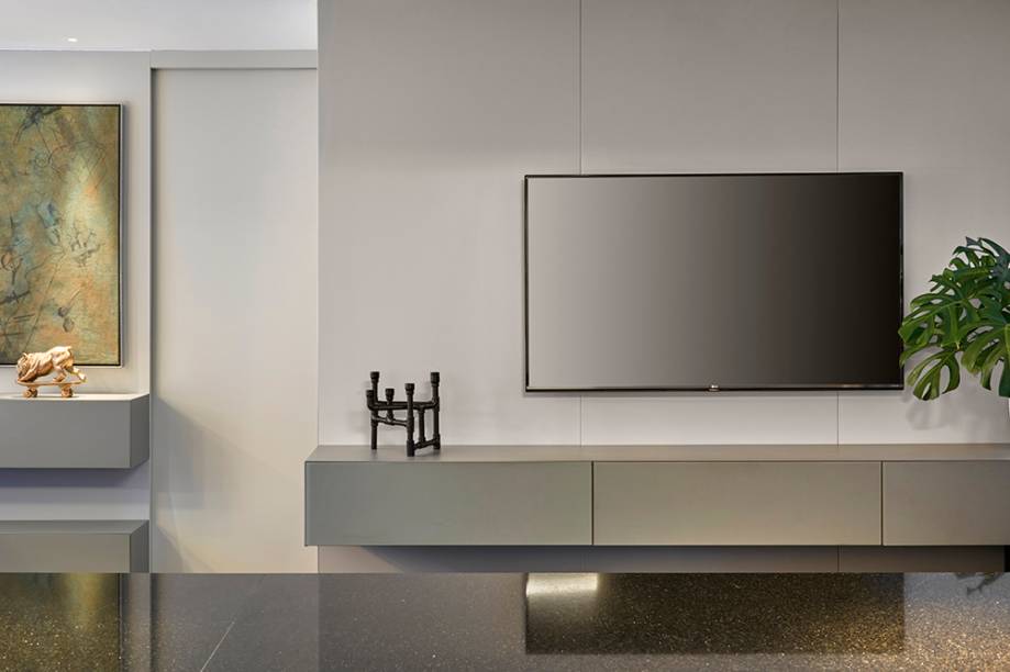 A marcenaria possui linhas retas e microtextura, aplicada no próprio MDF. Seu design é sóbrio e minimalista, o que confere elegância para os ambientes. Já a iluminação é feita usando spots de luz e de luminárias. Por ser direcionada, ela valoriza o mobiliário e os revestimentos, conduzindo o olhar dos visitantes.