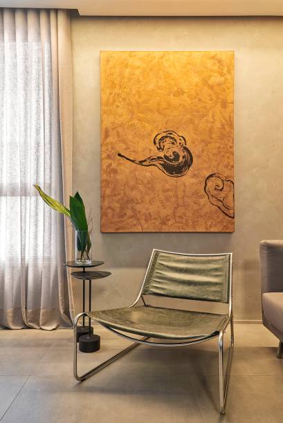 O piso e as paredes possuem cores claras, em tons acinzentados de cimento. Para não deixar o espaço muito frio, foi instalada uma parede de tijolinhos aparentes na sala, uma solução para dar cor à casa. Além dela, um grande sofá verde se destaca, junto de uma pintura dramática.