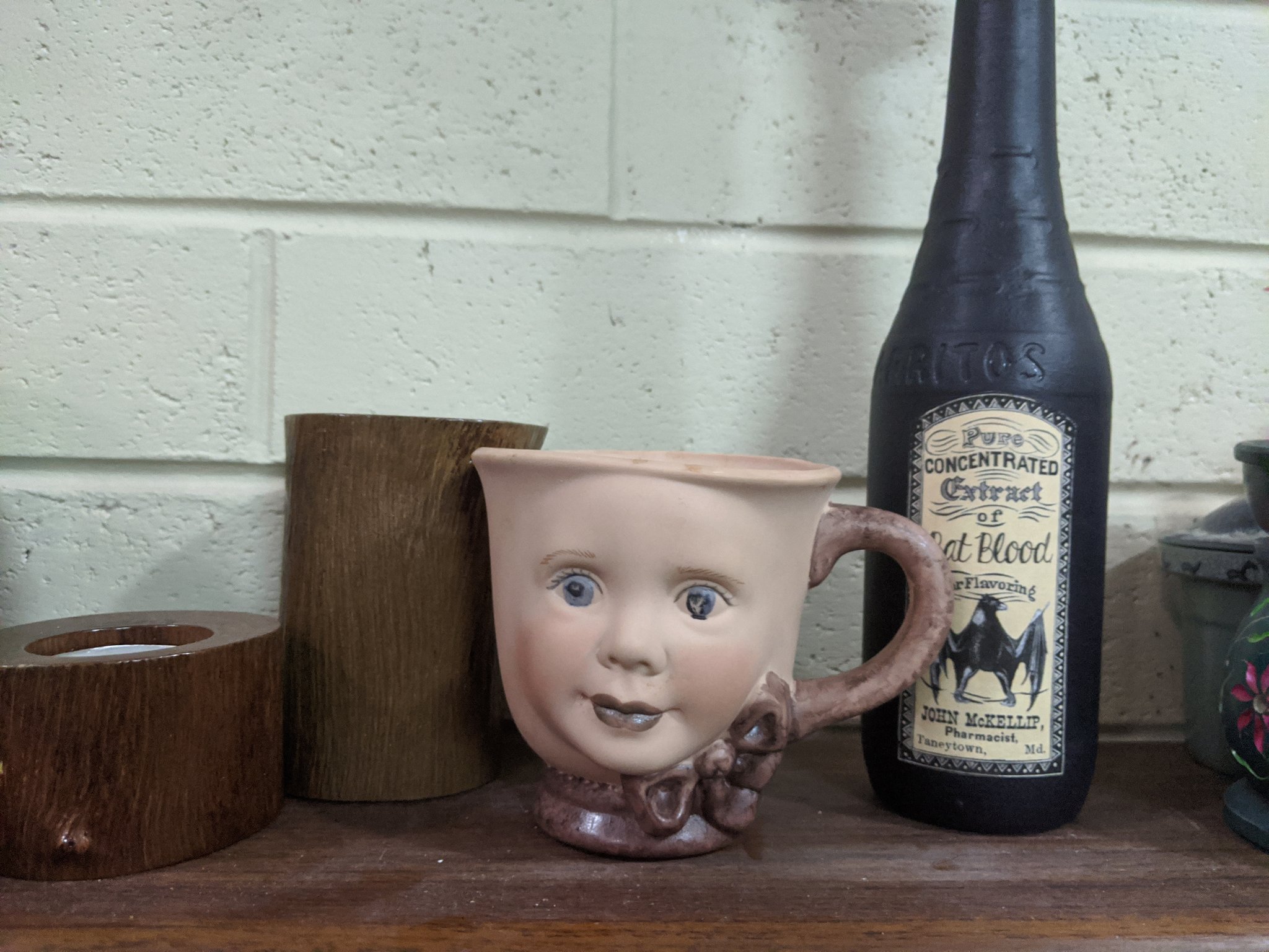 “Eu fiz isso na aula de porcelana quando era criança (é de um molde, eu não esculpi isso e tive ajuda). Eu amo o quão ridículo e assustador isso é. Eu planejo fazer uma suculenta falsa para colocar dentro. Também, se você olhar de perto, os olhos parecem que estão derretendo.”