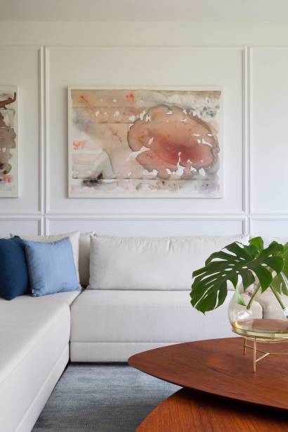 Na paleta, predomina o branco, com alguns pontos coloridos nas obras de arte e nos objetos decorativos. Um destaque é o piso de tacos, acomodados no formato espinha de peixe, que foi restaurado.