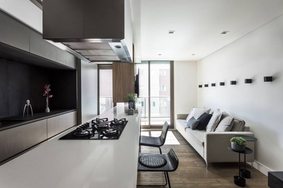 O estilo clean e industrial se misturam neste apartamento de 65 m². O desafio de transformar o local em um espaço amplo, contemporâneo e que fugisse do comum foi dado às arquitetas Carolina Danylczuk e Lisa Zimmerlin, da UNIC Arquitetura, que trouxeram ao ambiente o equilíbrio entre tons de cinza, branco e preto em composição com o aconchego dos detalhes de madeira.