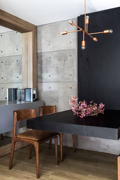 Um dos pontos altos do projeto é o revestimento de placas de concreto, que envolve todos os ambientes da área social. O material garante o tom industrial do apartamento, dá unidade ao espaço e ainda evidencia a mesa de jantar ligada à parede. Vale o destaque para o quadro A Peruana, da fotógrafa Mana Gollo. Para dar maior amplitude à sala de jantar, ainda foram colocados painéis com espelho, alternativa que também auxilia na difusão da luz natural.