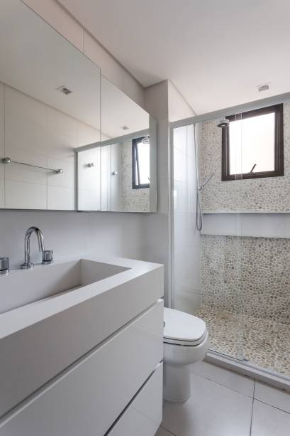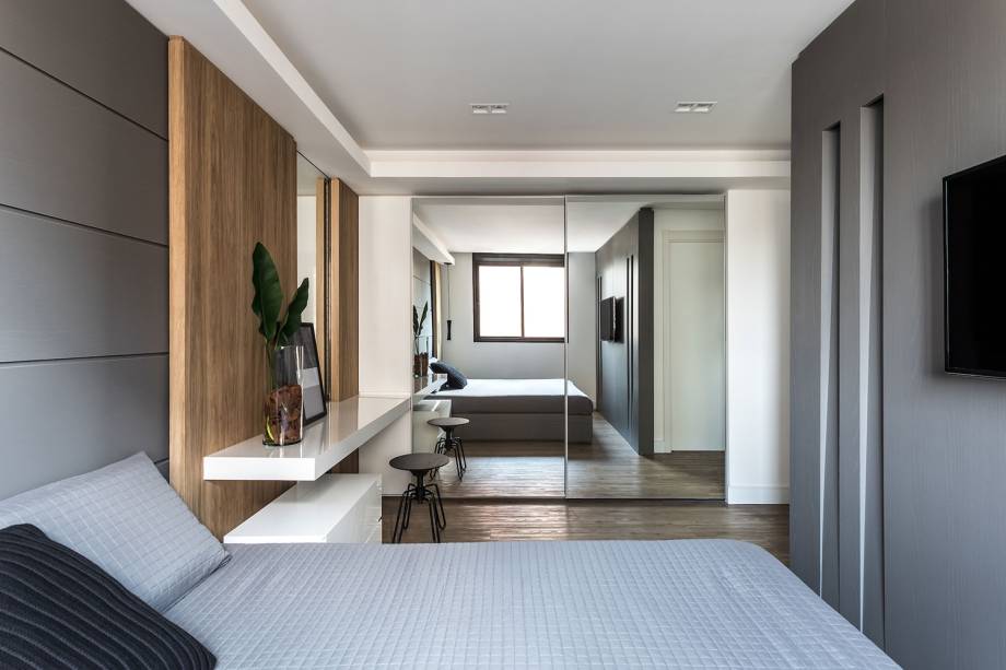 A suíte mantém a mesma linguagem e o conceito do apartamento, com o uso de tonalidades de cinza, branco e preto, além da madeira, que garante o tom aconchegante.