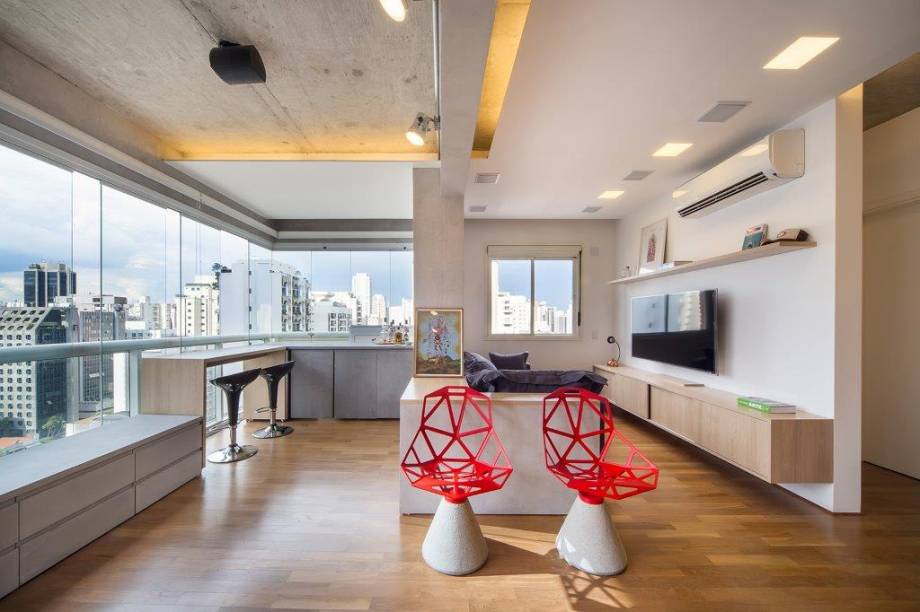 O apartamento Pole Dance, como foi chamado o projeto, recebeu lajes de concreto aparentes na varanda e na sala, que buscam uma referência underground para o apartamento.