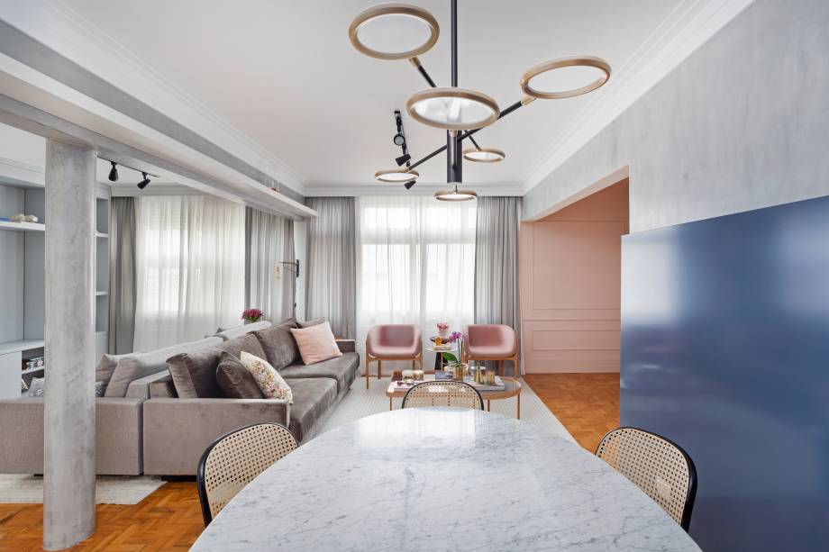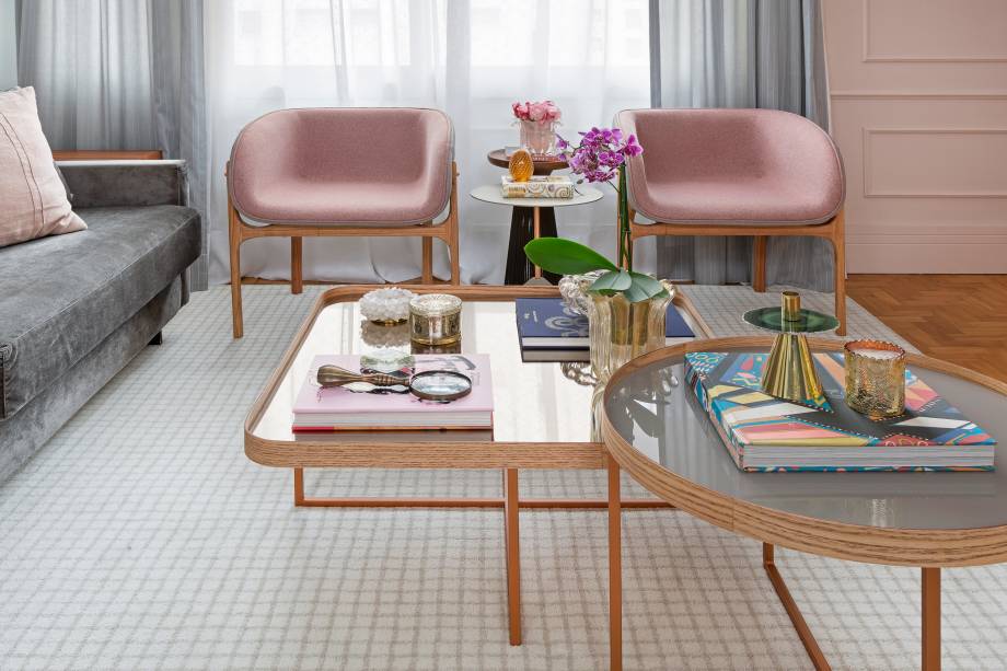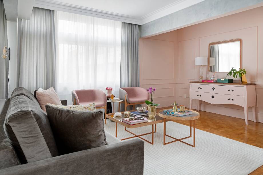 O ambiente de 37 m² recebeu uma paleta rosa e cinza e reaproveitou peças antigas do acervo familiar