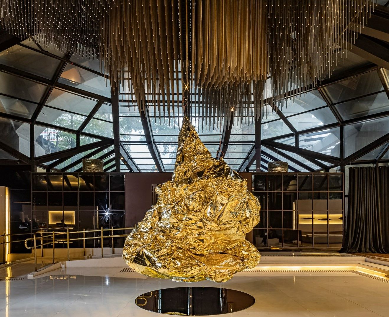 A Árvore de Natal que o estúdio projetou especialmente para o hotel é montada em uma estrutura de metal revestida em papel dourado que “dança” no lobby conforme o vento e movimentação de cada visitante do hotel.