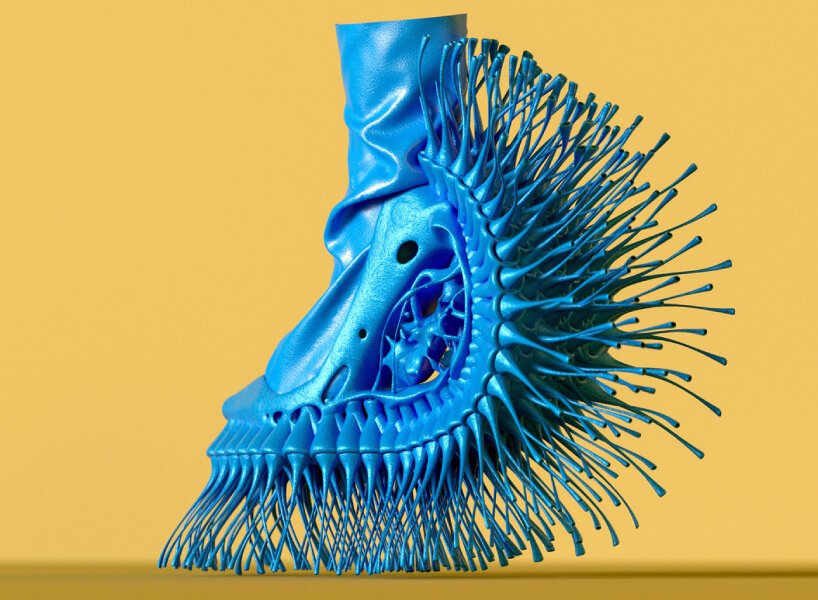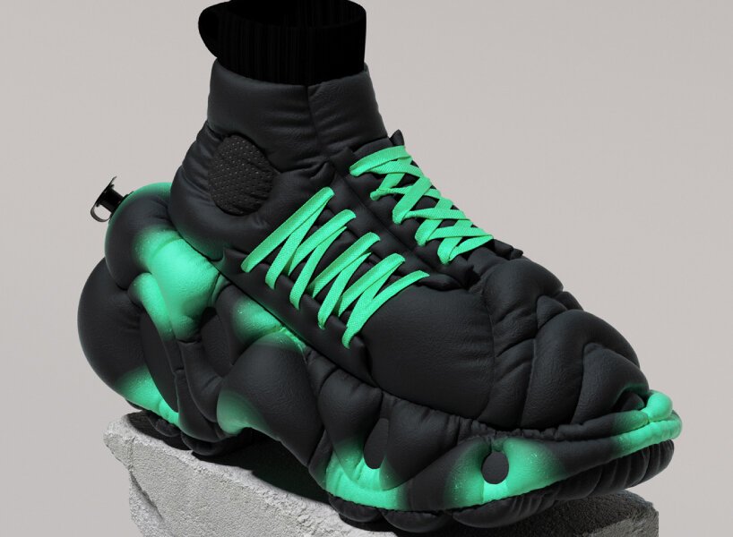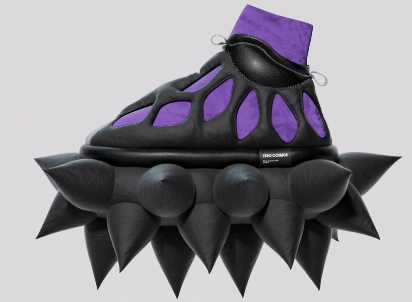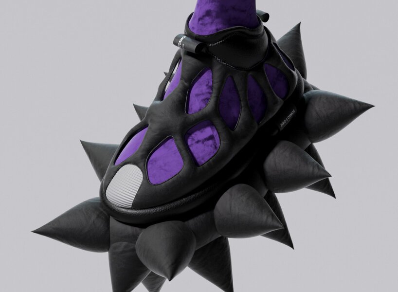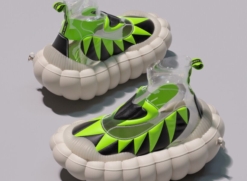 Como o designer compartilha, alguns de seus sapatos conceituais têm uma textura macia e um tamanho inchado, enquanto outros parecem se assemelhar a criaturas mutantes com seus espinhos e tentáculos gelatinosos.