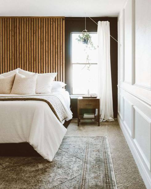 Se você busca uma peça de baixo orçamento, mas com uma aparência elegante, esse é um exemplo. Aqui, o tapete tecido à mão foi incorporado na estrutura da cama.