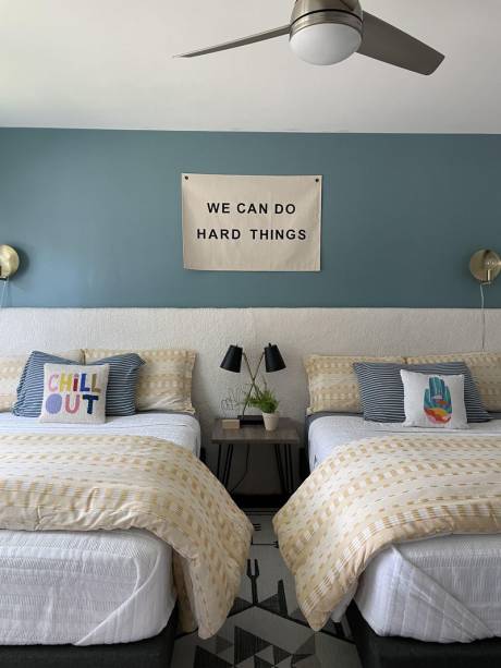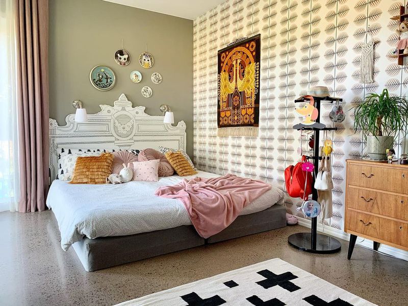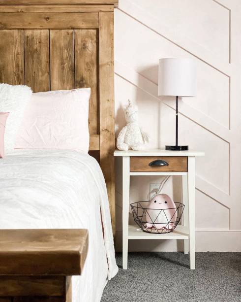 A combinação da cabeceira de madeira simples com uma peça de arte original de cores vivas e uma parede padronizada deixou o ambiente com um visual divertido!