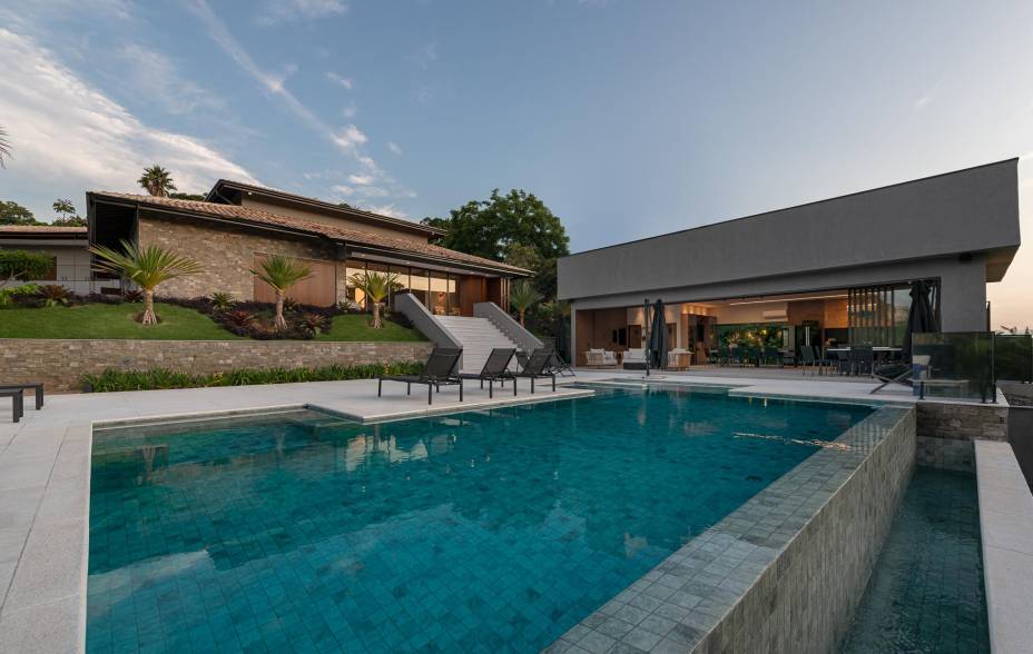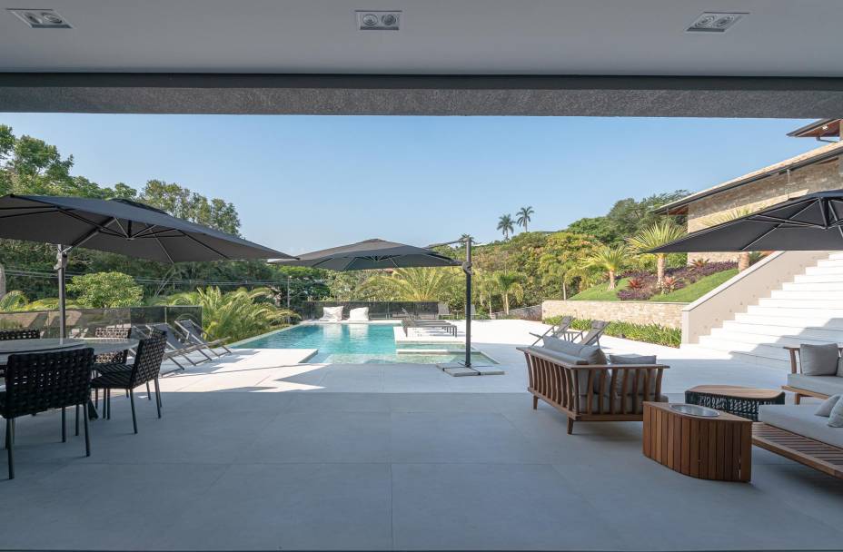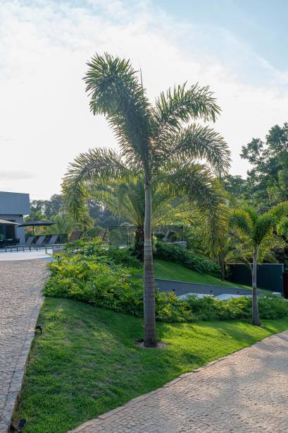 Para trazer o maior aproveitamento do espaço, aproveitar os desníveis e valorizar a área da piscina, que ganhou privacidade por ser voltada para a frente do condomínio, a paisagista usou as copas da canarienses junto com ipês brancos. A piscina fica no mesmo nível que essas espécies e, juntas, fazem um fechamento e garantem privacidade.
