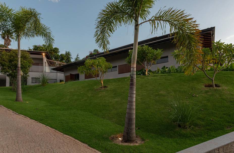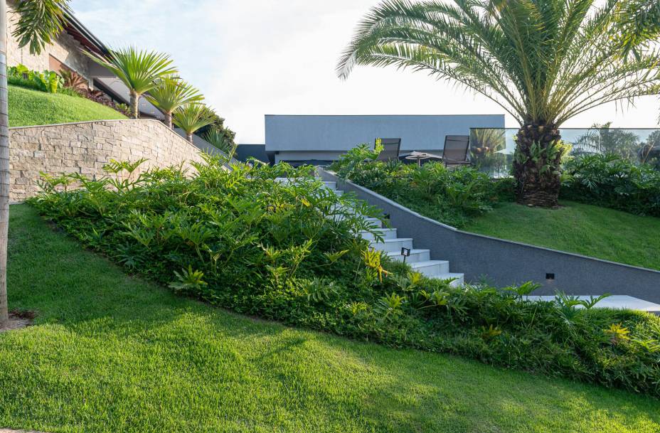 A entrada da casa traz uma escadaria de quase 15 m: para acompanhar todo o trajeto, a lateral da escada é conduzida e decorada por uma vegetação verde e volumosa. Uma das plantas utilizadas aqui foi o capim, muito rústica e, ao mesmo tempo, delicada, com suas plumas diferenciadas.