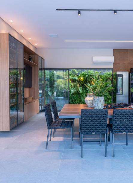 O jardim vertical que dá vista para a área gourmet agrega ainda mais valor ao ambiente que foi projetado para conviver, contemplar e receber amigos e familiares. Aqui, a exuberância é garantida por folhas grandes e variadas, contemporâneas de baixa manutenção.