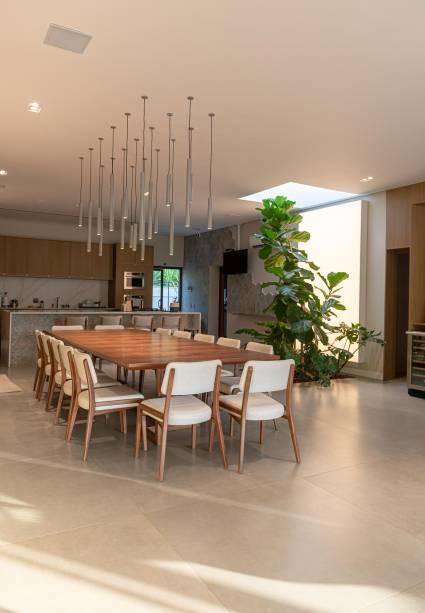 Dentro da casa, o destaque fica para o jardim interno, que ganhou um ficus lyrata plantado dentro de uma caixa de concreto. Importante ressaltar que, como ele está dentro da casa, foi usado o recurso da caixa, super fechada, para baixo do nível da terra, com toda drenagem necessária, para que a planta possa viver por muito tempo nesse espaço.