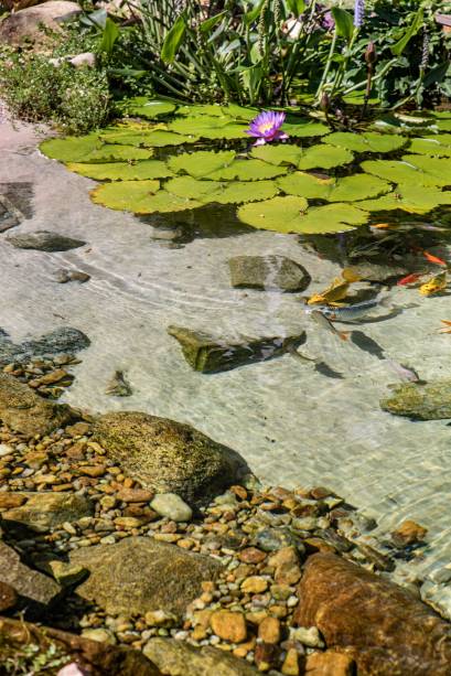 No quesito plantas, foram usadas ninféias, que, além de embelezar a lâmina d’água com suas folhas e flores, ainda servem de abrigo para os peixes. Já nas margens, rotalas, inhame roxo, pontederia e xanadu fazem a transição para as plantas próximas que estão fora d’água.