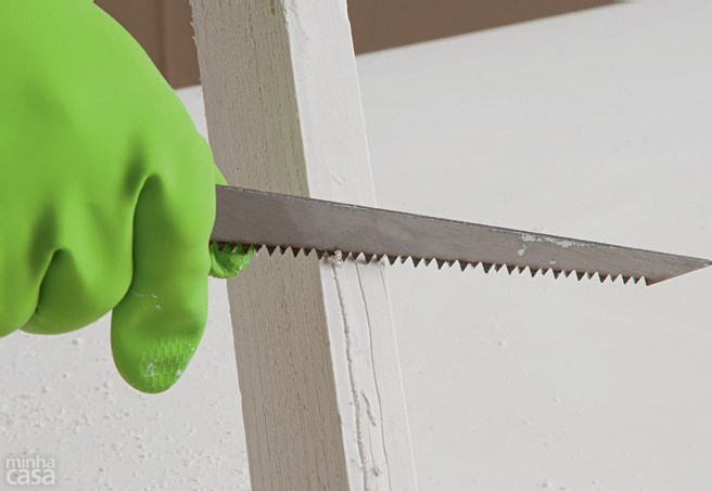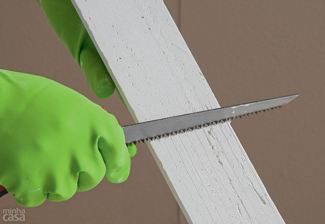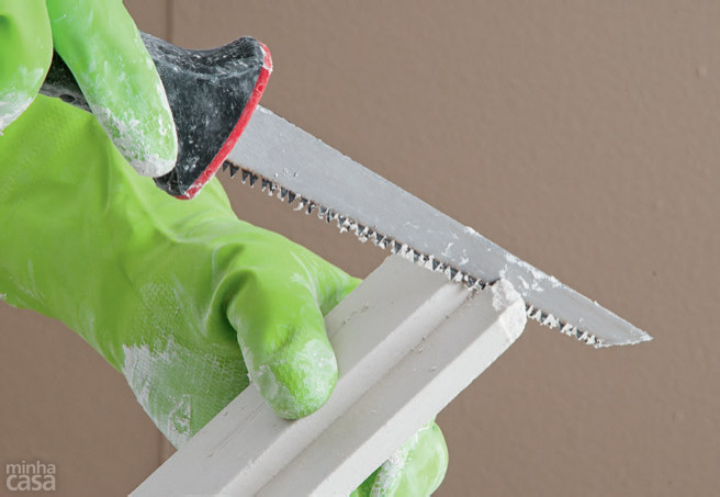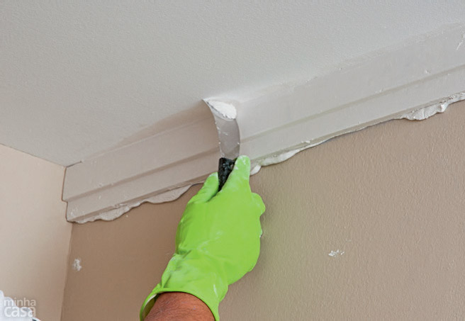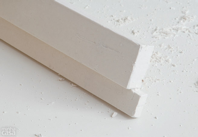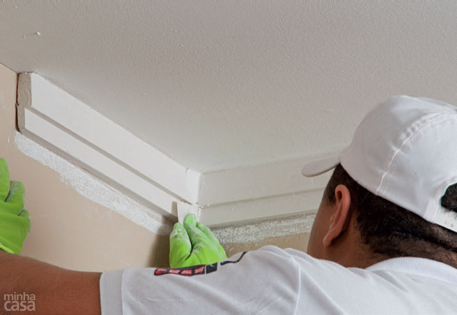 Fique com a dica do especialista Ulisses Militão: o bom resultado da execução é conquistado com o gesso ainda úmido. Por isso, compre-o 24 horas antes ou até mesmo no dia da colocação. “A peça seca corre o risco de empenar”, alerta. Outra medida esperta é raspar o verso e as laterais das baguetes antes de assentá-las. Isso porque os fabricantes untam a superfície para impedir que o gesso pronto grude na mesa onde é confeccionado. “Ao desgastá-las, elimina-se essa proteção e obtém-se mais porosidade, fator importante para a aderência da cola”, explica o gesseiro. E cuidado com o manuseio, visto que os modelos se quebram facilmente. Por fim, saiba que, após a instalação, será preciso repintar o cômodo, pois a massa que fixa as molduras, assim como a tinta que lhes dá acabamento, certamente mancharão o teto e as paredes.