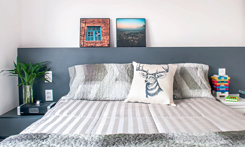 6/16A decoradora Cláudia Bitelo planejou para a irmã uma cabeceira valorizada por recortes decorativos. Os retângulos foram aplicados sobre a placa lisa do mesmo material. As sobras da chapa ainda renderam duas mesinhas laterais (50 x 30 cm), fixadas na cabeceira.(Ricardo Jaeger (Rs)/Minha Casa)