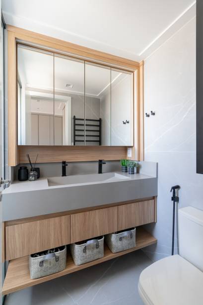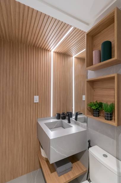 Os dois banheiros têm revestimentos no tom cinza marmorizado no piso e paredes, mas enquanto o banheiro master foi mais otimizado em questões de marcenaria para abrigar os itens de uso no dia a dia, o lavabo ganhou um grande painel ripado com perfis iluminados que deixaram o ambiente mais sofisticado.