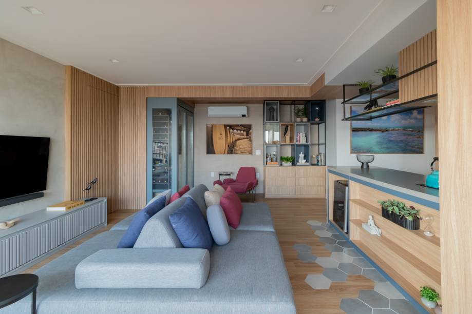 A cozinha conta com uma ilha generosa e bancada. Já a sala de TV dispõe de um rack contínuo que se conecta com um banco na sacada.