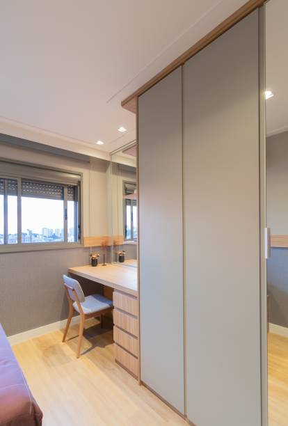 Uma porta ripada em MDF camuflada dá acesso à área íntima. A suíte master ganhou painéis de madeira até o teto e um armário extra. O outro dormitório foi pensado como um quarto de hóspedes e também home office. Ali também há uma penteadeira com um grande espelho com iluminação de LED embutida.