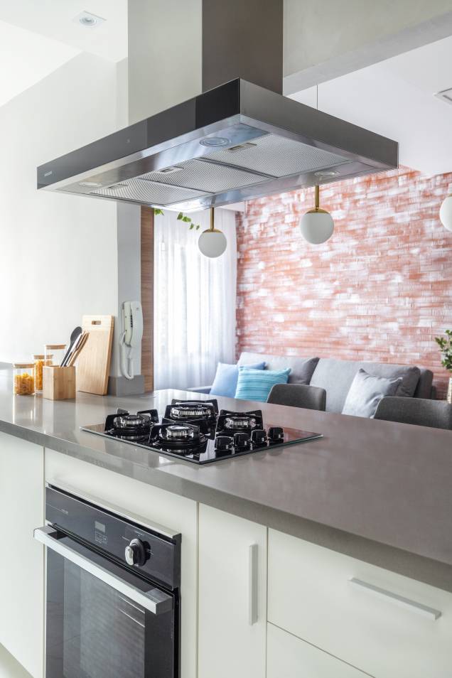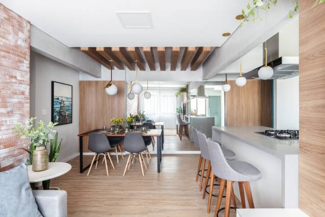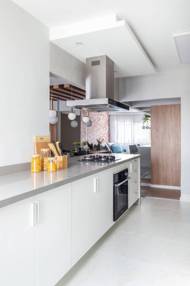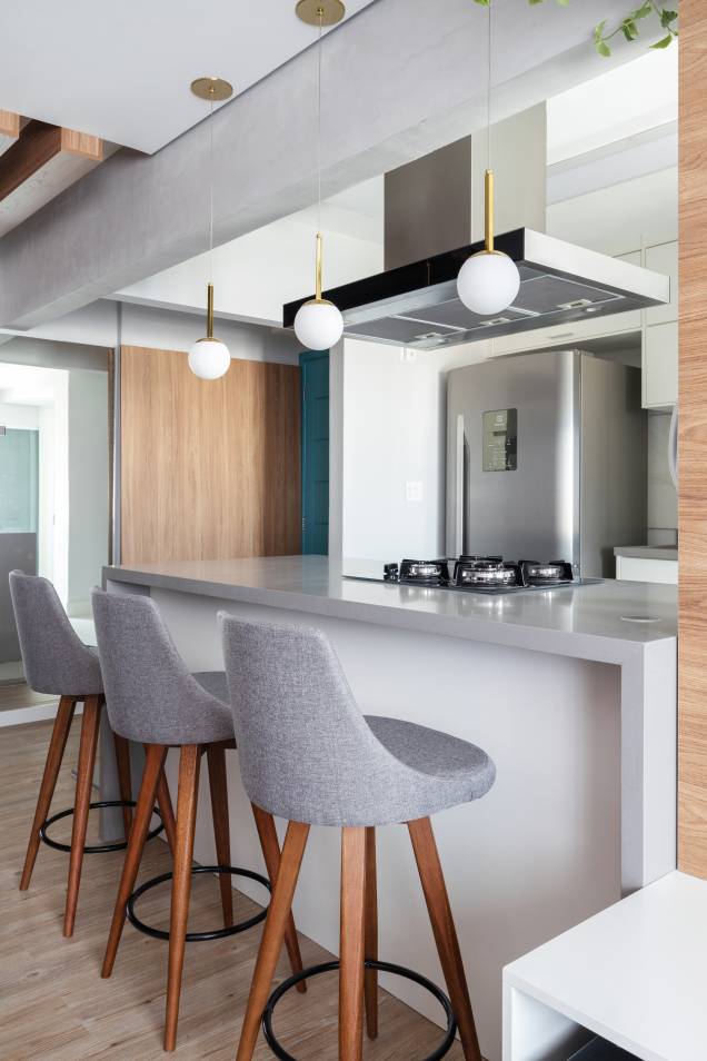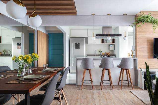 A principal proposta foi integrar os ambientes, especialmente entre a cozinha e a sala de jantar/estar. A criação de uma ilha central se tornou o ponto de encontro entre os dois espaços, funcionando tanto como uma área de preparação quanto como uma extensão da convivência.