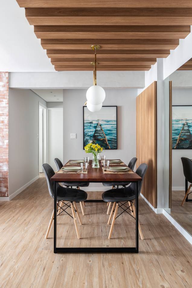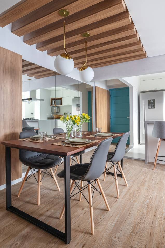 A paleta de cores foi uma das chaves para criar a atmosfera de praia solicitada pela cliente. Elementos como o ripado de madeira no teto da sala de jantar e a porta de entrada azul proporcionaram o toque de frescor e acolhimento que o projeto buscava.