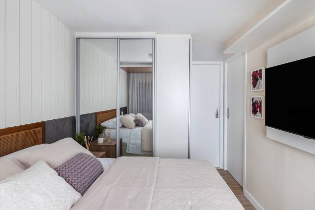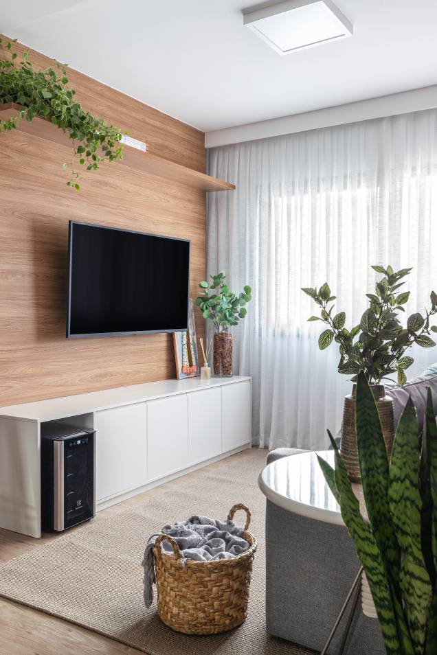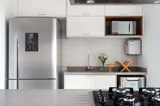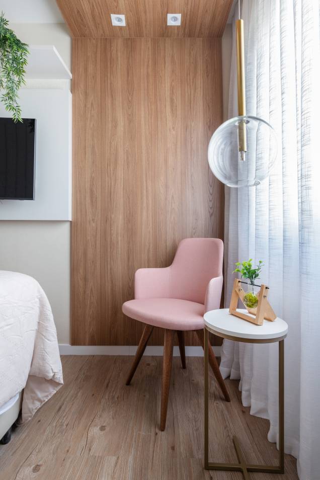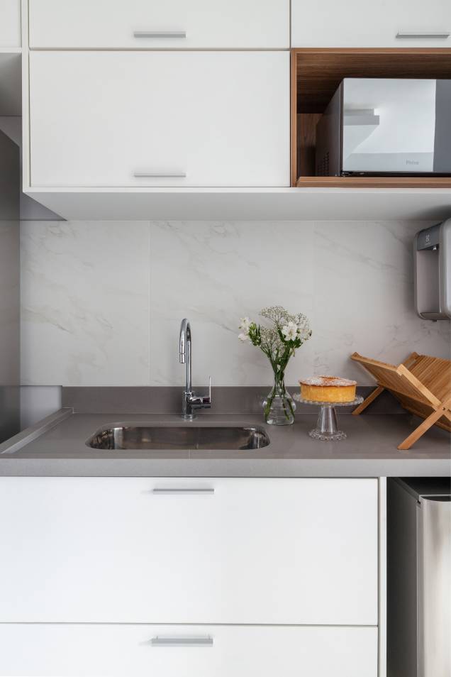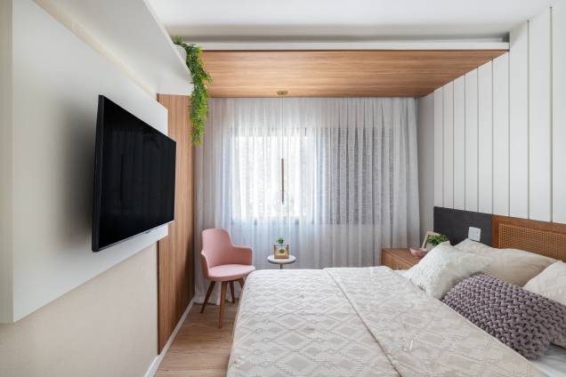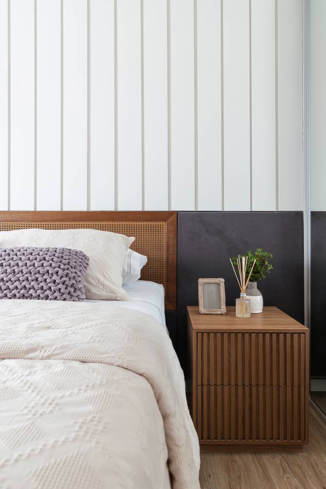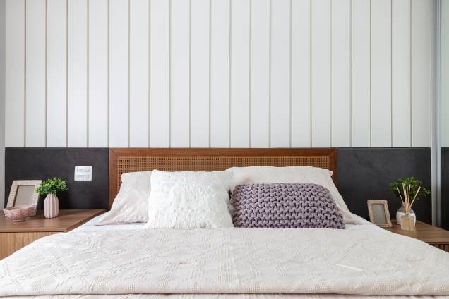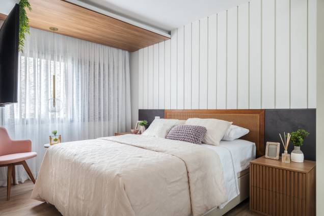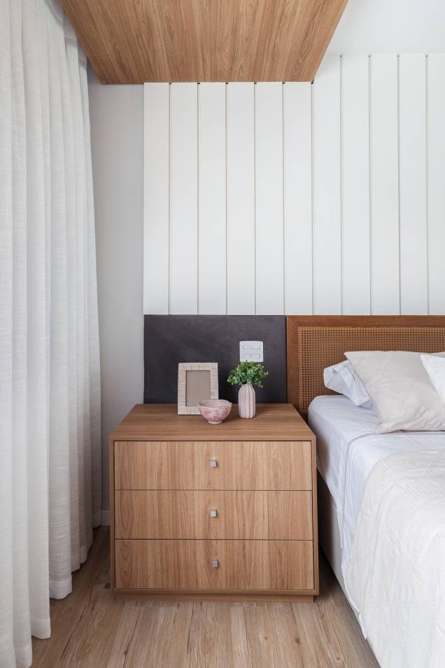 Tons amadeirados, acabamentos em branco e sutis toques de preto harmonizam os aspectos modernos e aconchegantes do ambiente, enquanto garantem uma sensação de tranquilidade.