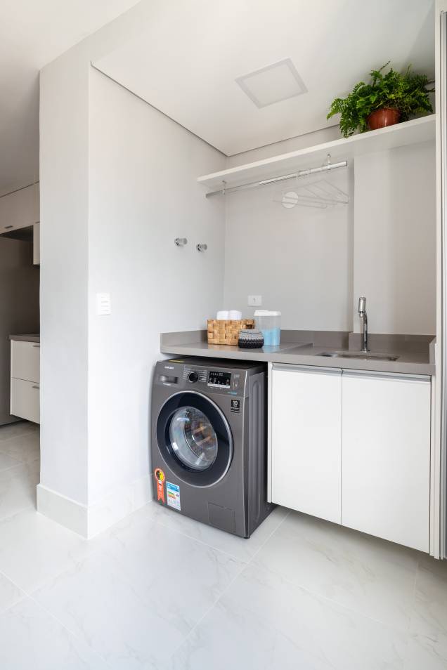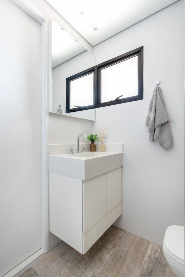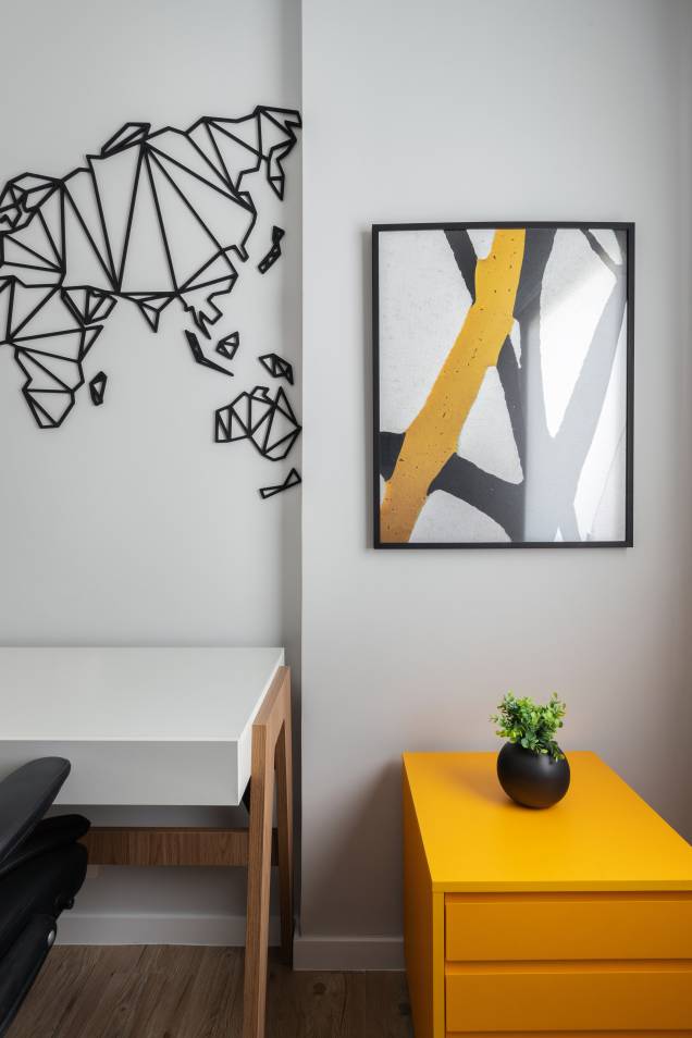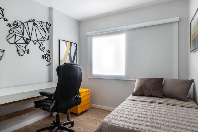 Além disso, o layout foi reorganizado para otimizar o espaço, incluindo a conversão de um dos quartos em um home office, dando resposta à necessidade de flexibilidade e praticidade.