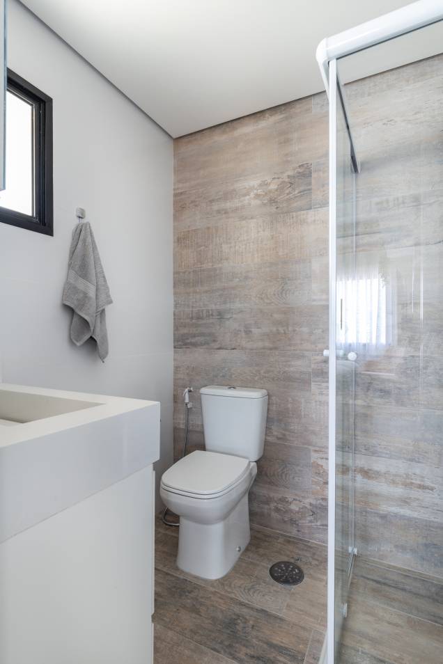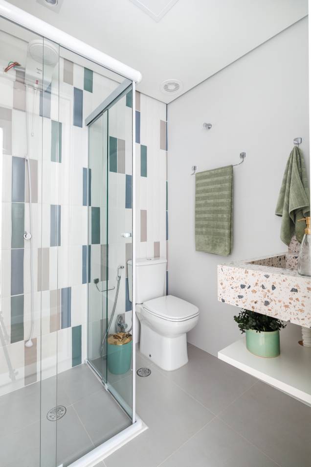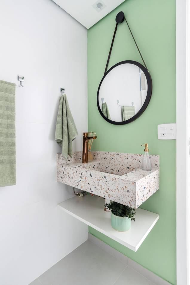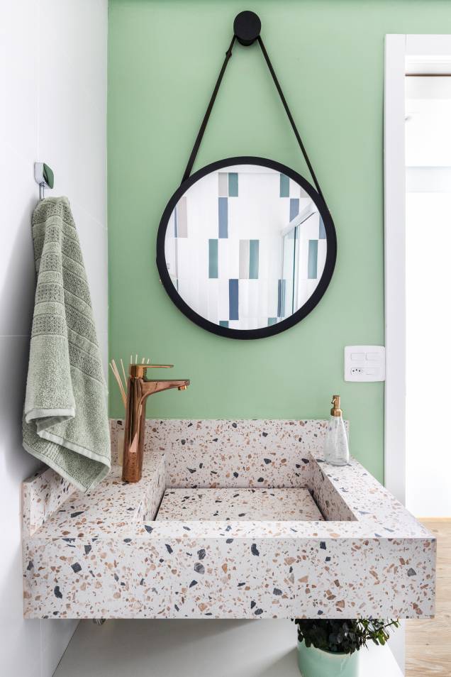 Nos banheiros, a escolha de cores e acabamentos também foi pensada para trazer personalidade e frescor. Paredes em verde menta e revestimentos com acabamentos diferenciados, como o confete em tons suaves e modernos, criam uma atmosfera com uma identidade única.