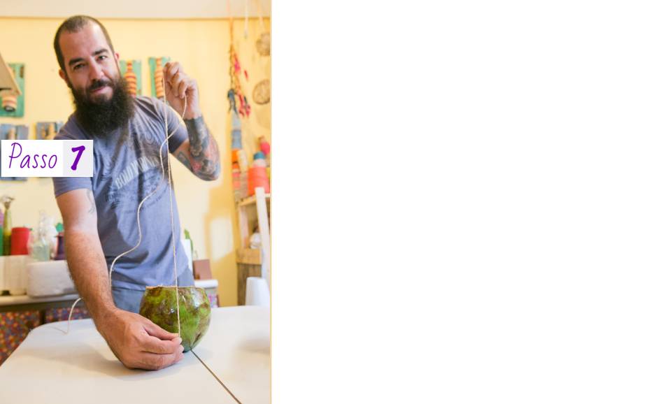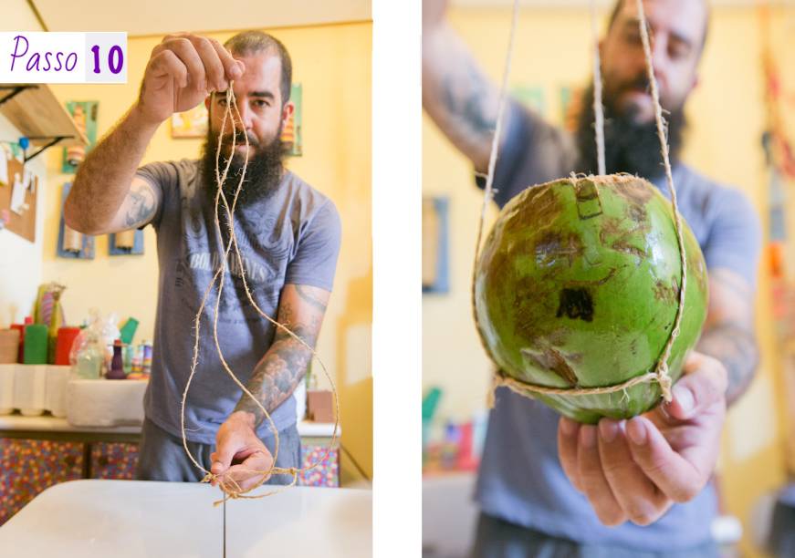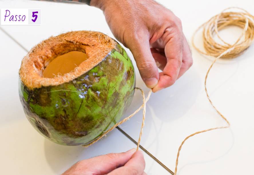 - Encaixe o coco sobre a estrutura de sisal, ajustando as cordas para que ele fique nivelado.