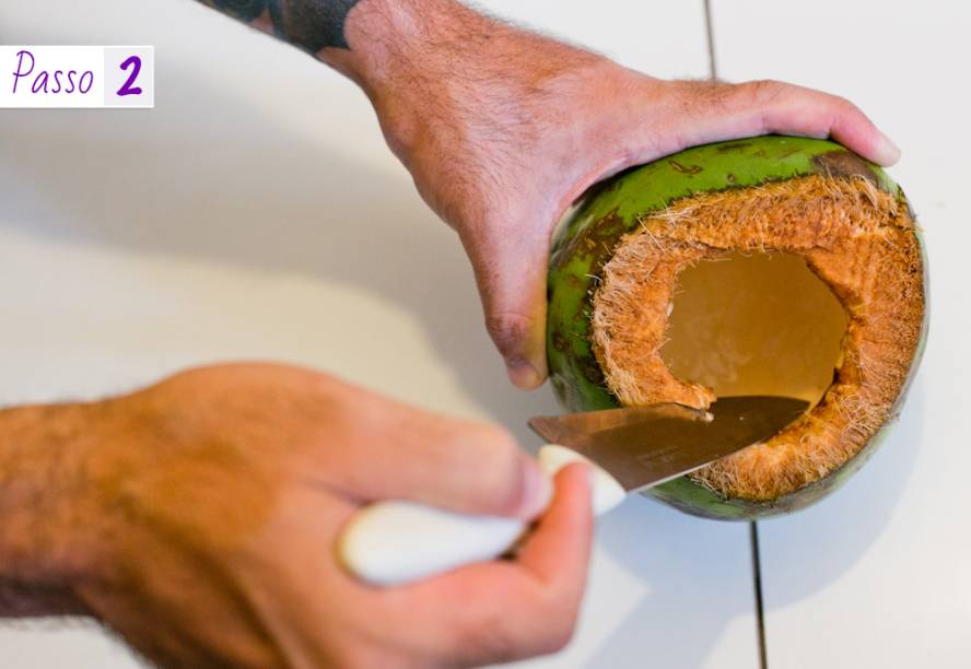 - Comece abrindo o coco com cuidado e removendo toda a água e polpa. Utilize a faca para ampliar a abertura, facilitando a colocação das flores posteriormente.