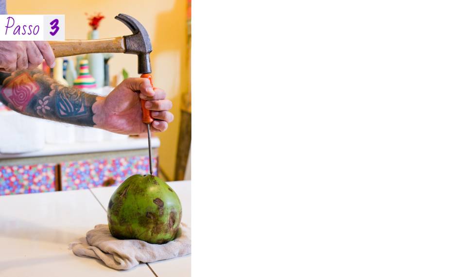 - Com a chave Philips e o martelo, faça três furos pequenos na base do coco para garantir a drenagem adequada da água.