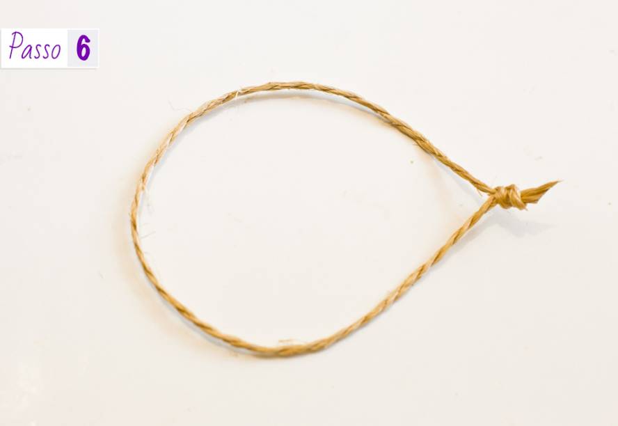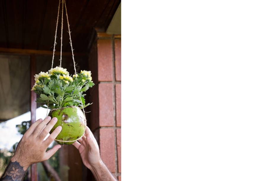 - Meça a circunferência da base do coco com a corda de sisal e corte um pedaço nesse tamanho. Una as pontas com um nó firme, formando um círculo que servirá como base para o vaso.