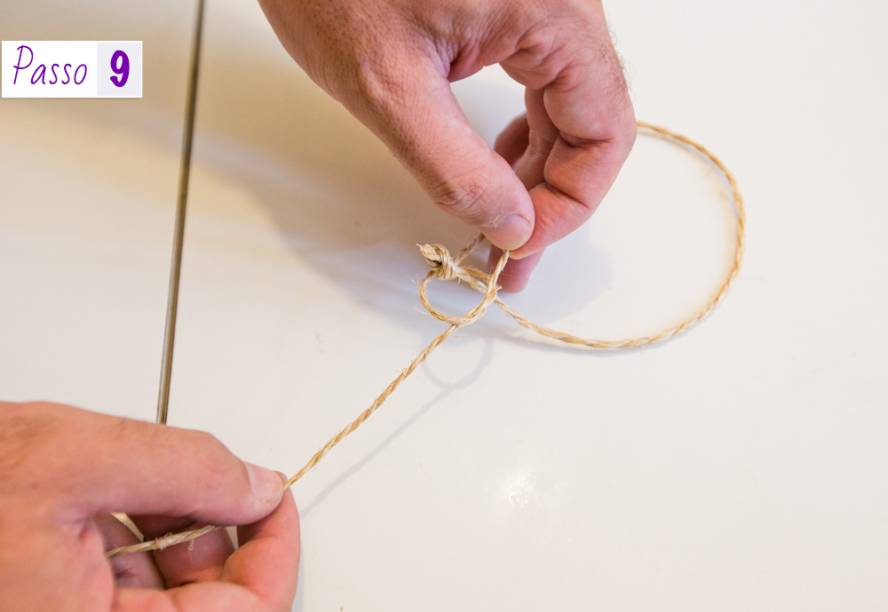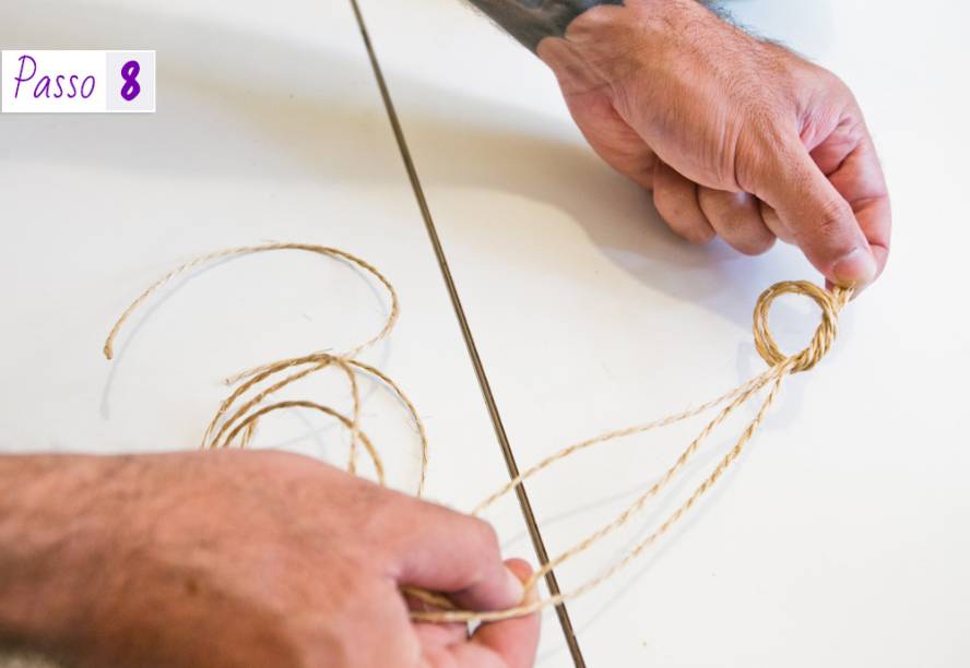 - Corte três fios de sisal com cerca de 80 cm cada um. Essa medida pode ser ajustada de acordo com a altura desejada para pendurar o vaso. Una as pontas dos fios em um nó resistente.
