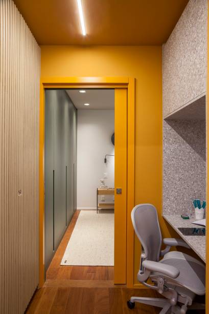 Além disso, uma pequena área de home office foi estrategicamente posicionada na circulação íntima, entre os dois dormitórios, criando um espaço de trabalho prático e integrado.