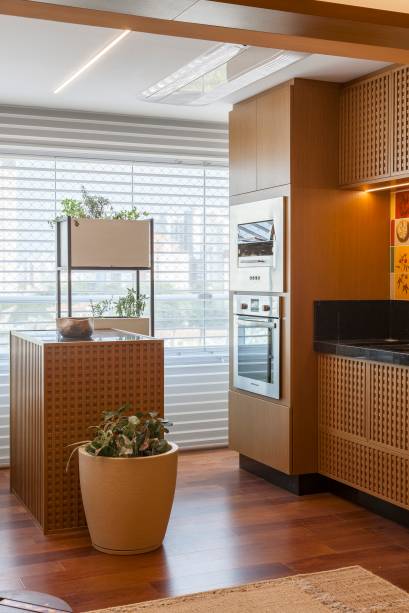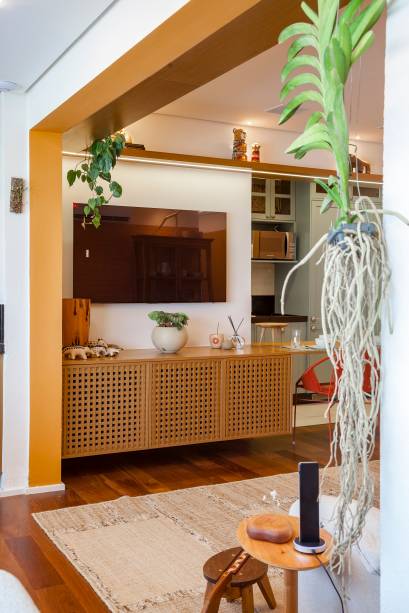 O muxarabi na sala permite a ventilação dos equipamentos eletrônicos, enquanto no terraço a peça apresenta um design mais fechado, garantindo privacidade e conforto.