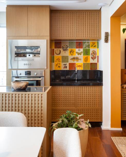 Uma das joias do projeto é a presença de painéis de azulejos personalizados da artista plástica Calu Fontes, que conferem um toque de exclusividade e arte ao lar.