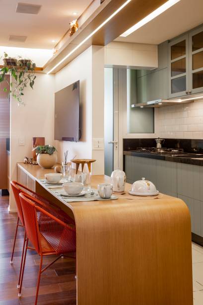 A cozinha, projetada com um balcão em altura de mesa, acomoda cadeiras comuns, proporcionando um ambiente ideal para refeições rápidas e encontros familiares.