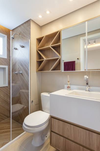 No banho master, o porcelanato amadeirado Itagres, combinado ao acabamento beige acetinado, traduz a sensação de acolhimento, enquanto o banheiro social ganha personalidade com revestimentos 3D da Venas e o mosaico Chevron, criando um jogo de volumes marcante.