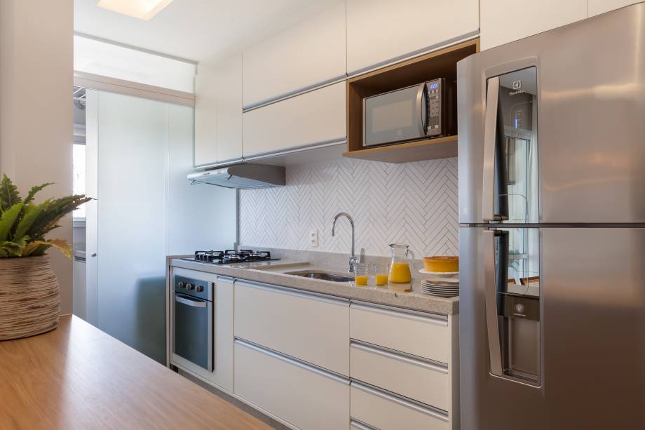 Na cozinha, a paginação em escama de peixe, aliada a tons amadeirados e claros, reforça a harmonia visual e a sensação de amplitude.